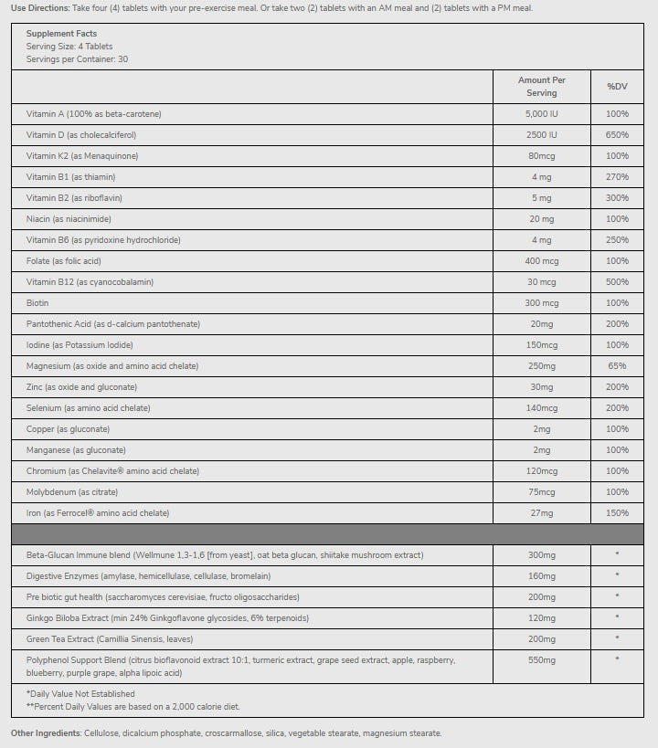 MULTIV-PRO delivers a number of unique benefits in one powerful endurance formula. It provides the most bioavailable vitamins and chelated minerals available, including a full-spectrum antioxidant and polyphenol blend and key nutrients, like ginkgo biloba and green tea extract- all of which have been shown in clinical studies to improve performance.