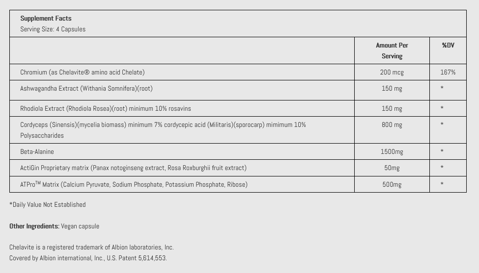 A: This new formula contains the adaptogenic herb ashwagandha. Research shows ashwaganda improves VO2max, modulates cortisol and increases work output. We have substituted 150mg of Rhodiola with 150mg of ashwagandha. The new formula delivers 150mg Rhodiola, 150mg ashwagandha, 800mg cordyceps, 200mcg chromium, 50mg ActiGin and our proprietary ATPro matrix.