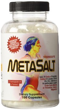 Thermolyte MetaSalt (100 Capsules) SODIUM (SALT) - ELECTROLYTE / ANTIOXIDANT Complex Sodium as Sodium Chloride, TriSodium Phosphate, Sodium R-Lipoate, with Potassium, Calcium, Magnesium as Krebs Cycle Minerals with OptiZinc and Selenium as antioxidants, and Vitamin D3 COMPARISON: MetaSalt is the only sodium supplement which provides sodium as Sodium Chloride, TriSodium Phosphate and Sodium R-Lipoate, which work together to maintain the optimal metabolism of sodium to prevent dehydration (a decrease in total body water without an equal reduction in total body sodium) and prevent volume depletion (a loss of body water and sodium resulting in decreased extracellular fluid volume). MetaSalt is the best SALT supplement and goes beyond salt capsules and salt tablets. It is more than just a salt capsule it is a high-performance ELECTROLYTE complex with Potassium, Calcium and Magnesium as Krebs Cycle Minerals. It is also a potent anti-oxidant complex with Selenium and OptiZinc. Before you buy any other product for ELECTROLYTE replacement or for heat fatigue and muscle cramps, compare the ingredients and their amounts -- and the price Its the only one and the best, the most effective and most efficient SODIUM - Electrolyte/Anti-Oxidant complex. CARBO-PRO + MetaSalt for any endurance activity under the sun * Provides Four macrominerals (SODIUM, Potassium, Calcium, and Magnesium) which are important for performance * Provides two most potent anti-oxidants Selenium Methionine and Zinc Mono-methionine as crucial anti-oxidants which prevent ongoing free-radical damage during exercise * Vitamin D3 * Macromineral imbalance (primarily sodium imbalance) usually occurs during long or ultra-distance events in the heat * Macromineral/Electrolyte imbalance may either occur due to excessive water intake, or due to excessive sweat production and sweat sodium concentration * Two capsules of THERMOLYTE provide 300 mg of Sodium (750 mg of salt - sodium chloride) * Its balanced with Potassium, Magnesium and Calcium as high performance Krebs Cycle Mineral Complex * Minimizes muscle cramps or heat prostration due to excessive perspiration, and prevents Hyponatremia * Makes it easy to control sodium/electrolyte intake without the excess sugar provided by other sports drinks * Selenium Methionine (organic form) and OptiZinc work together with the body's endogenous anti-oxidants, during exercise activity, to convert free radicals into harmless residues, mainly water and carbon dioxide * Take MetaSalt capsules, consume the required amount of water and CARBO-PRO and you are all set with hydration, calories, and sodium to maintain peak levels of performance